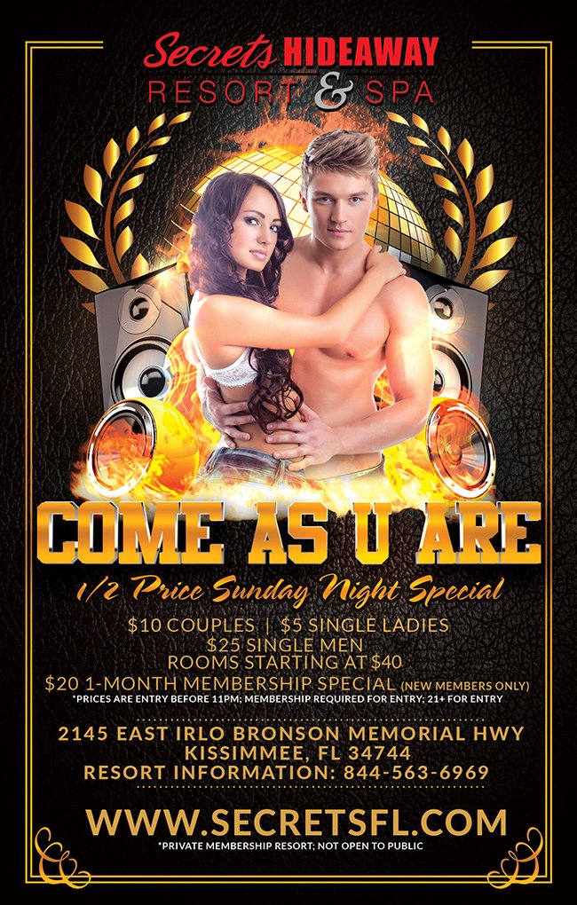 As the weekend comes to a close, it’s time to let loose with us and your sexy friends. It’s 1/2 price entry tonight. Couples: $10, Single Ladies: $5, Single Men: $25. Rooms starting at $40. $20-1 month membership (New Members Only). Dress as sexy as you want or just Come as U Are to have fun, drink, dance and have some sexy fun. We want you to be as comfortable as possible. Just think how much fun it will be to dance all night, have some drinks, then head off to the Playroom.