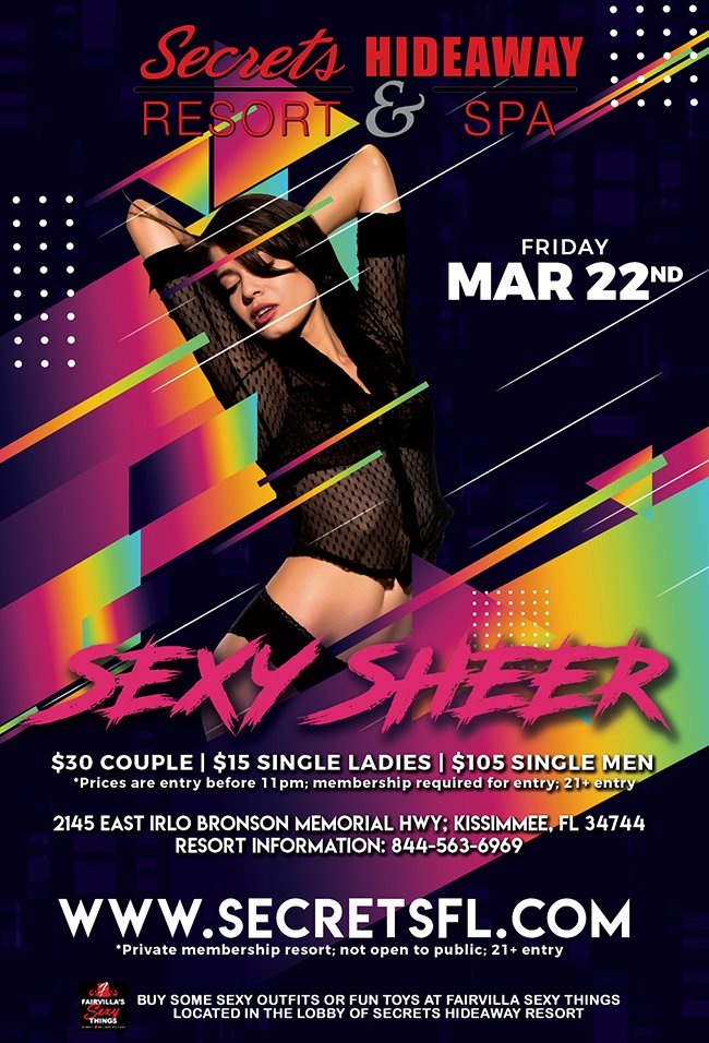 There is nothing sexier than almost bare, and tonight we want to see how close to nude you can be. Drape your body in sheer sexiness and tease all your friends tonight at Secrets Hideaway Resort and Spa. With an enormous dance floor, two bars, 5 stripper poles and plenty of plush seating, you’ll find new and adventurous ways to push the boundaries and see just how sexy sheer can really be!