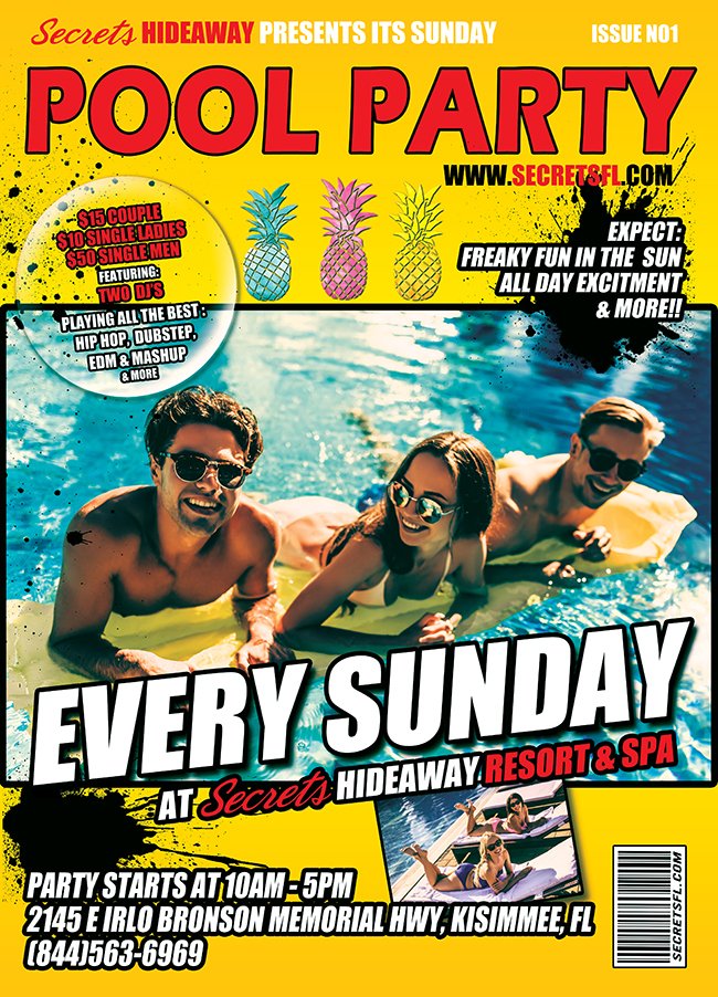 All the parties are located at Secrets Hideaway Resort & Spa®. For reservations: Visit our reservations page Click here for Reservations , call 844-563-6969 or book by clicking the Red "Book a Room" button at the top of each event page.