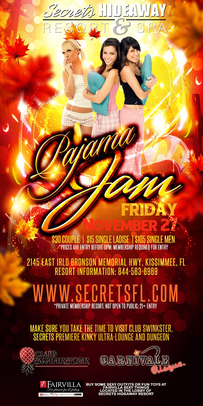 It’s a PJ party tonight at Secrets Hideaway Resort & Spa, and we want to see your most playful nighties! The party goes all night long and bedtime is postponed so come dressed to impress as you rock the dance floor! Work up a sweat on one of 5 dance poles then get ready to strip down in the playrooms for late-night naughtiness. From silky robes to fluffy mules, we want to see your most jaw-dropping fashions as Club Secret celebrates the most intimate aspect of the Lifestyle - PJ Parties!