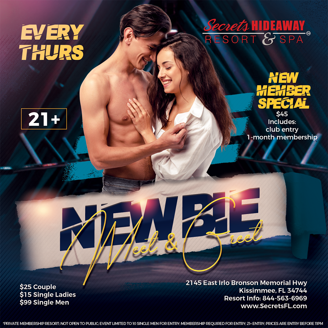 For only $45 per couple, you’ll receive a one-month membership to Secrets Hideaway Resort and Spa, plus club entry to the hottest newbie night in the industry. Really ready to escape the mundane? Grab a few new accessories at our on-site boutique, Fairavilla’s Sexy Things, and take a dip in our clothing-optional pool, or meet new friends in one of our indulgent hot tubs. Then, get ready to party in Club Secret, complete with large dance floor, comfy couches, and the most popular dance music. Really ready to explore the lifestyle? We offer multiple indoor playrooms where you can put on a show, meet new couples, visit our dungeon, and create your wildest fantasy! So, what are you waiting for? Join us on Thursday nights and get ready to create some secrets of your very own!