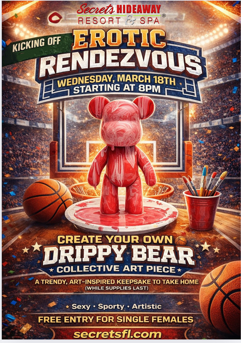 Tip off in true Secrets Hideaway style with Erotic Rendezvous, a playful, art-forward night where competition meets creativity. Guests are invited to channel their inner artist and create their own trendy, drippy bear art piece — a bold, collectible keepsake to take home (while supplies last).