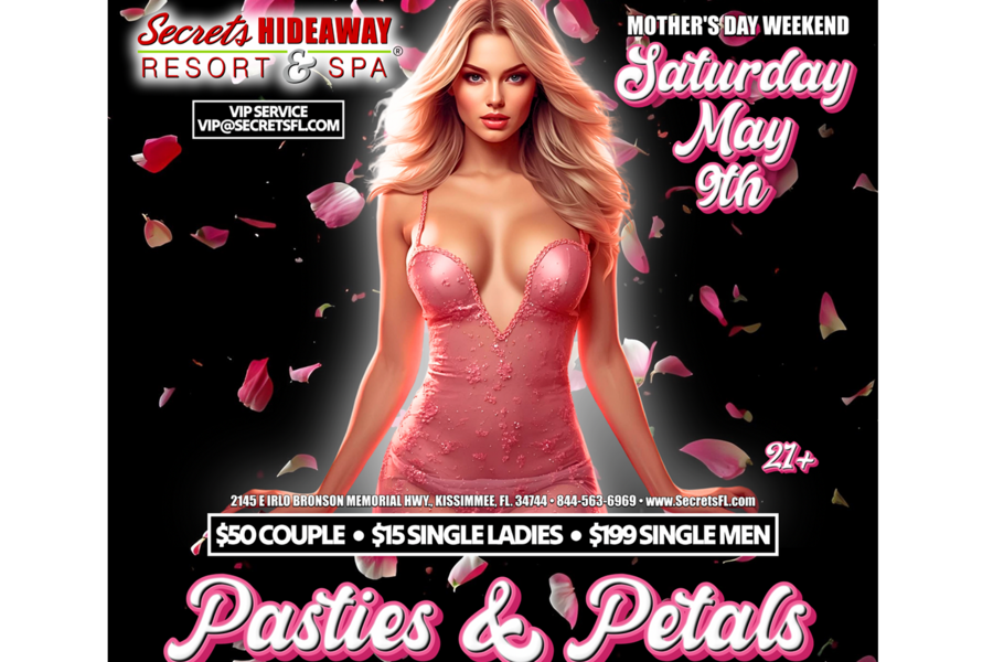 As the music sways and the lights create a soft, seductive glow, the dance floor transforms into a garden of desire filled with flirty energy and unforgettable connections. Whether you're showcasing your favorite petal-covered look or admiring someone else’s seductive style, this night promises a sensual celebration unlike any other. Join us for “Pasties & Petals” and let this Mother’s Day weekend bloom into something truly unforgettable—only at Secrets Hideaway!