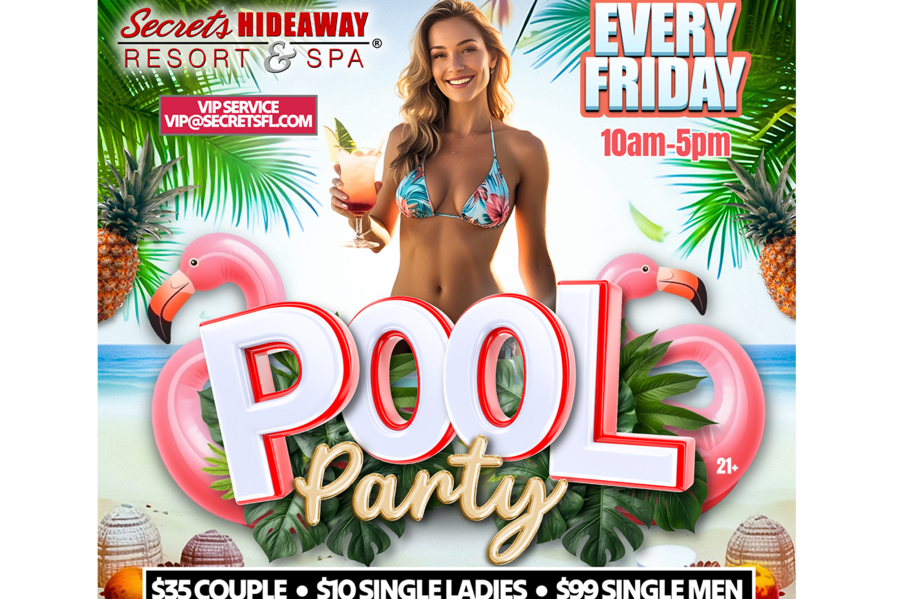 The Friday Pool Party at Secrets Hideaway invites you to unwind and celebrate the start of the weekend amidst a vibrant, tropical atmosphere. For those seeking a touch of luxury, renting a cabana offers eight hours of pure indulgence, providing a comfortable and intimate space to enjoy the company of your favorite friends. It's an opportunity to escape the routine, bask in the warm Florida sun, and connect with like-minded souls in an environment that exudes a sense of freedom and camaraderie. Starting your weekend off right with the Friday Pool Party guarantees an unforgettable experience, surrounded by the laughter, energy, and excitement of your Secret's friends, making it the ideal way to set the tone for an amazing weekend ahead.