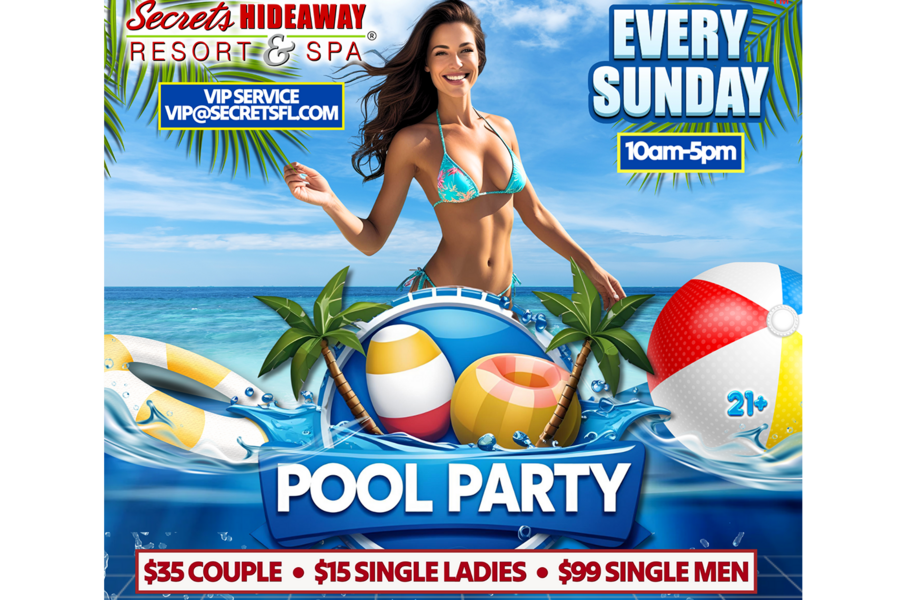 Sundays have never been more liberating! Join us every Sunday from 10 am to 5 pm for the ultimate relaxation and rejuvenation at Secrets Hideaway's Sunday Pool Party. Whether you're extending the weekend fun with Sunday Funday or winding down from a wild adventure, this day is tailored for pure bliss under the warm Florida sun. Forget about swimsuits – at this clothing-optional paradise, come as you are and stretch out in one of our two inviting pools, letting the radiant sunshine kiss your skin as you bask in complete relaxation. Our bubbling hot tubs offer a soothing escape, and the conversation pool provides the ideal setting to make new friends, sparking conversations that linger with the promise of exciting connections.