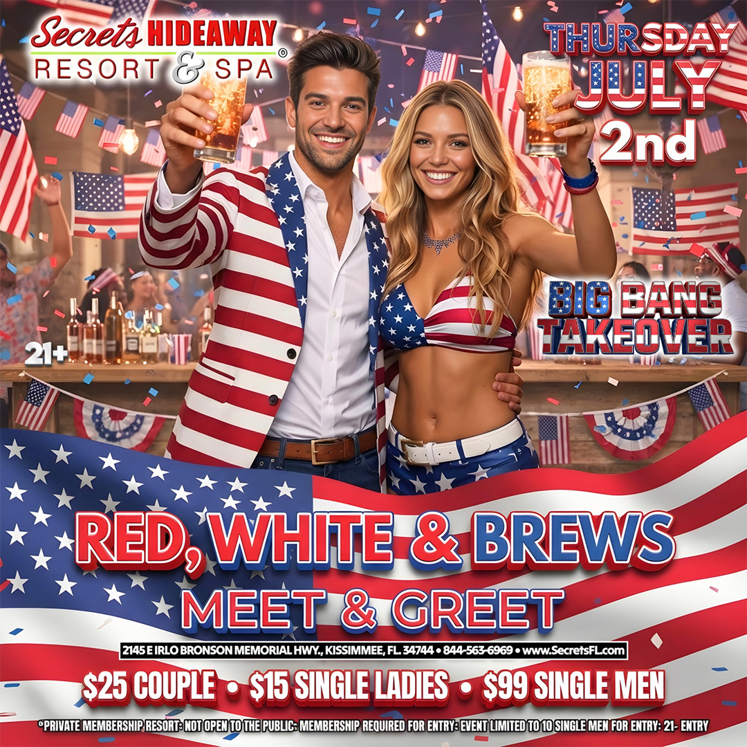 Get ready to ignite your Fourth of July festivities as Big Bang™ Independence Weekend Takeover at Secrets Hideaway presents “Red, White & Brews – Meet & Greet” on Thursday, July 2nd! Kick off your holiday bash right with an electrifying evening of ice-cold brews, bold patriotic vibes, and unforgettable connections. Slip into your sexiest red, white, and blue attire and mix, mingle, and toast to freedom with friends—new and old—at the hottest lifestyle resort in Florida.