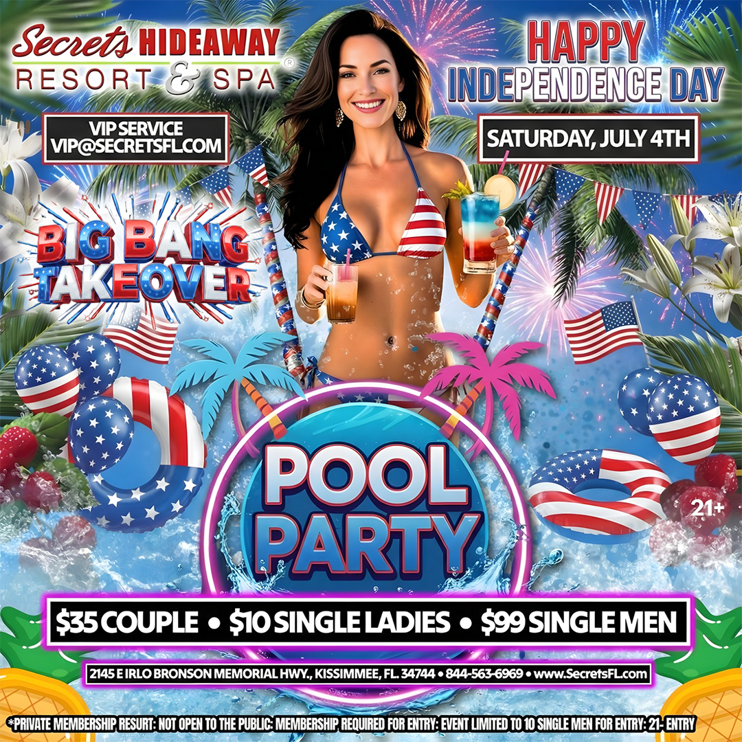 Get ready to indulge in the epitome of Saturday bliss at Secrets Hideaway's exclusive Saturday Pool Party, held every Saturday from 10 am to 5 pm. Shed your inhibitions along with your clothes and immerse yourself in the epitome of sensual freedom at Orlando's hottest clothing-optional pool event. With the sun beaming down and the temperature rising, Secrets Hideaway invites you to strip down, cool off, and join your sexiest friends for a day of pure, unadulterated pleasure. Picture yourself lounging poolside, drink in hand, surrounded by the rhythmic beats of hot music and the sizzling presence of even hotter friends. Secrets Hideaway Resort and Spa's courtyard pool area, complemented by two outdoor tiki bars, forms the perfect backdrop for this seductive rendezvous, where you can let go, be free, and celebrate the heat of summer in the most alluring way possible.
