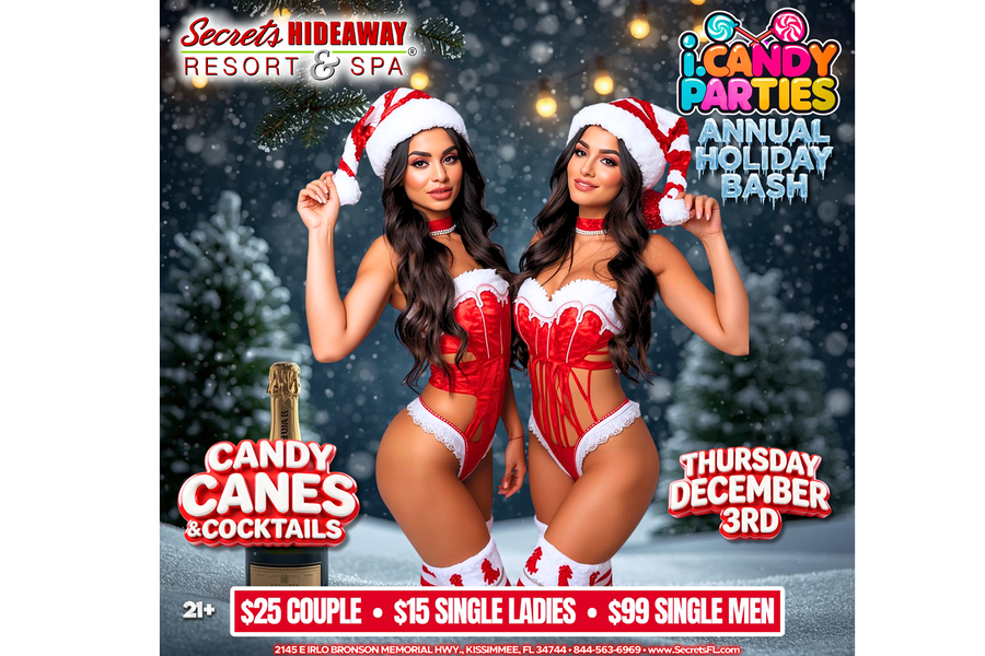 Kick off the holiday season in sweet style as i.Candy Parties Holiday Bash Takeover presents “Candy Canes & Cocktails” on Thursday, December 3rd at Secrets Hideaway. This festive night blends holiday cheer with the signature sexy energy you love, creating the perfect mix of sweet treats, strong drinks, and playful holiday vibes. Think red and white outfits, candy-inspired looks, flirty holiday accessories, and just the right amount of sparkle to get everyone in the spirit of the season.