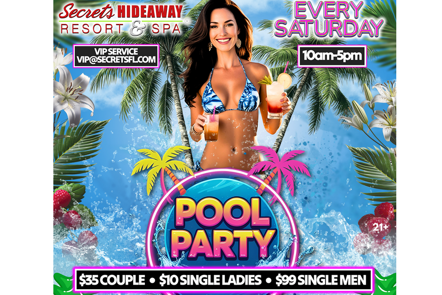 Get ready to indulge in the epitome of Saturday bliss at Secrets Hideaway's exclusive Saturday Pool Party, held every Saturday from 10 am to 5 pm. Shed your inhibitions along with your clothes and immerse yourself in the epitome of sensual freedom at Orlando's hottest clothing-optional pool event. With the sun beaming down and the temperature rising, Secrets Hideaway invites you to strip down, cool off, and join your sexiest friends for a day of pure, unadulterated pleasure. Picture yourself lounging poolside, drink in hand, surrounded by the rhythmic beats of hot music and the sizzling presence of even hotter friends. Secrets Hideaway Resort and Spa's courtyard pool area, complemented by two outdoor tiki bars, forms the perfect backdrop for this seductive rendezvous, where you can let go, be free, and celebrate the heat of summer in the most alluring way possible.