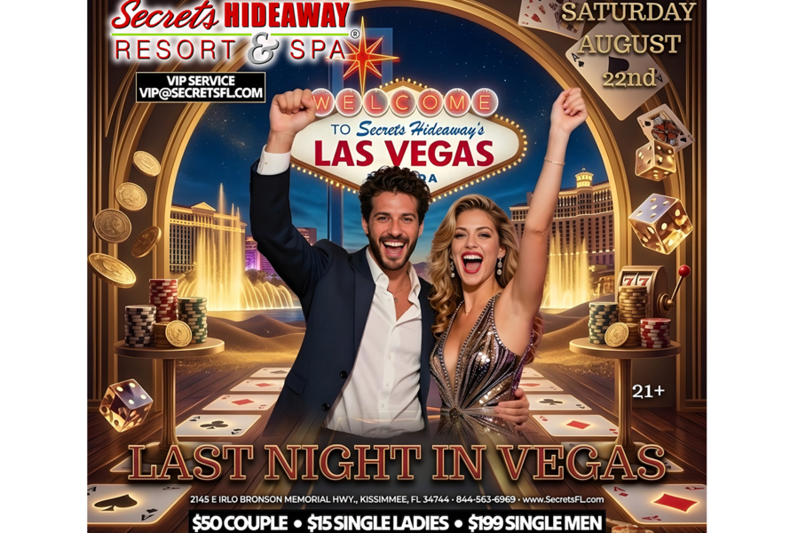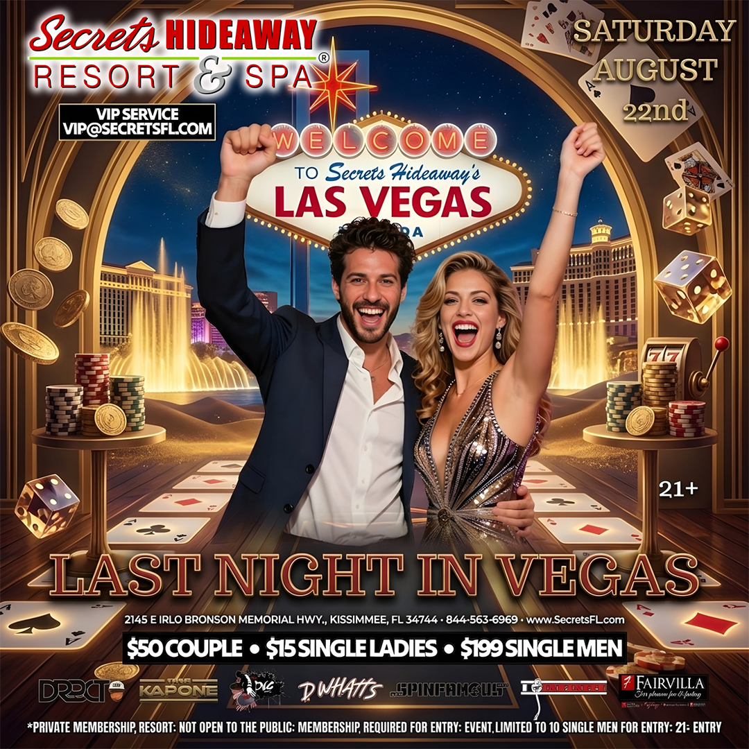 Roll the dice and step into a night of glitz, glamour, and high-stakes excitement as Secrets Hideaway presents “Last Night in Vegas” on Saturday, Aug 22nd! Experience the thrill of the Strip as Secrets transforms into a dazzling casino playground filled with showgirls, slot machines, poker tables, and craps. The lights will be bright, the energy electric, and every moment packed with that unmistakable Vegas-style buzz.