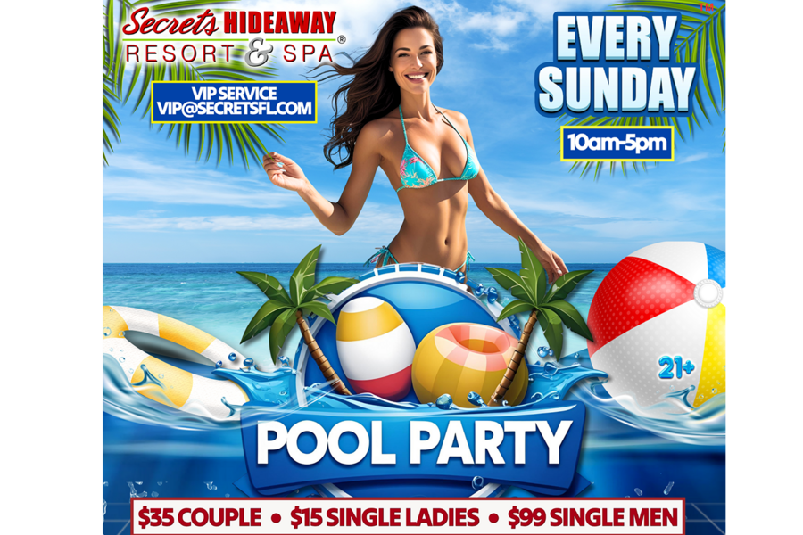 Sundays have never been more liberating! Join us every Sunday from 10 am to 5 pm for the ultimate relaxation and rejuvenation at Secrets Hideaway's Sunday Pool Party. Whether you're extending the weekend fun with Sunday Funday or winding down from a wild adventure, this day is tailored for pure bliss under the warm Florida sun. Forget about swimsuits – at this clothing-optional paradise, come as you are and stretch out in one of our two inviting pools, letting the radiant sunshine kiss your skin as you bask in complete relaxation. Our bubbling hot tubs offer a soothing escape, and the conversation pool provides the ideal setting to make new friends, sparking conversations that linger with the promise of exciting connections.