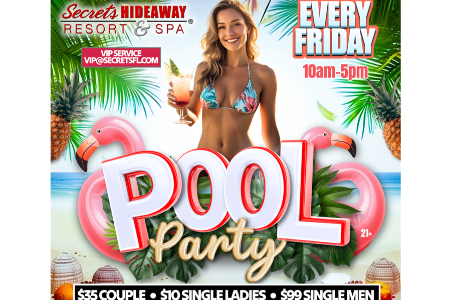 The Friday Pool Party at Secrets Hideaway invites you to unwind and celebrate the start of the weekend amidst a vibrant, tropical atmosphere. For those seeking a touch of luxury, renting a cabana offers eight hours of pure indulgence, providing a comfortable and intimate space to enjoy the company of your favorite friends. It's an opportunity to escape the routine, bask in the warm Florida sun, and connect with like-minded souls in an environment that exudes a sense of freedom and camaraderie. Starting your weekend off right with the Friday Pool Party guarantees an unforgettable experience, surrounded by the laughter, energy, and excitement of your Secret's friends, making it the ideal way to set the tone for an amazing weekend ahead.