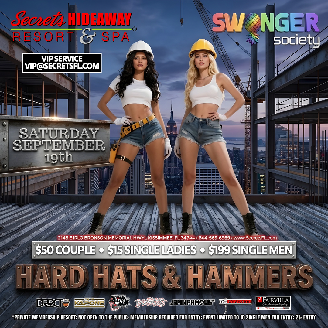 Get ready to build some serious heat as Swingers Society Takeover presents “Hard Hats & Hammers” on Saturday, September 19th at Secrets Hideaway. This rugged and playful theme brings out the sexy side of construction-inspired style—think hard hats, tool belts, boots, and just enough attitude to turn heads. Whether you’re rocking a bold, edgy look or keeping it flirty with a creative twist, the vibe is all about confidence, strength, and hands-on fun.